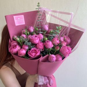 Букет из ароматных пионовидных роз и розовой гипсофилы, букет 306