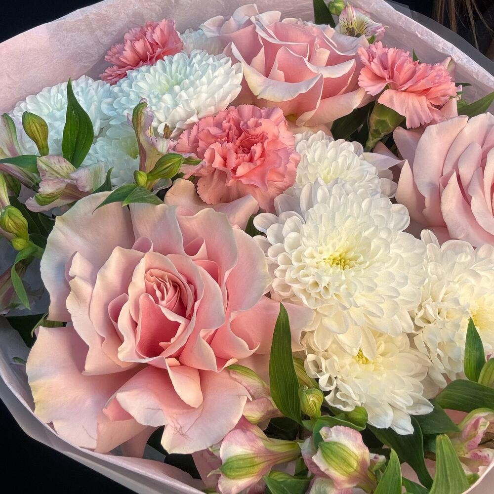 Нежный авторский букет из французской розы, кустовой хризантемы, розового диантуса и альстромерии. Такой букет не оставит никого равнодушным 🌸